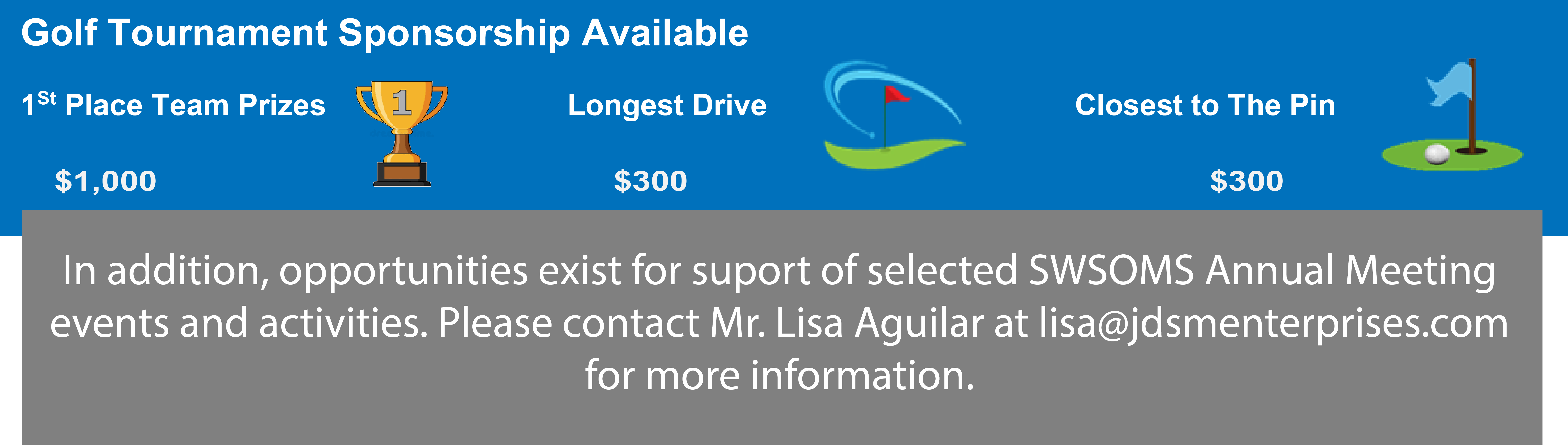 Platinum Level: $15, 000 – includes exhibit table; premium placement in the Exhibit Hall; full page ad in the SWSOMS Annual Meeting Program Book; recognition during the general meeting sessions; recognition on signage displayed throughout the meeting; placement of materials in meeting packets; two (2) tickets to the Saturday evening President’s Event.